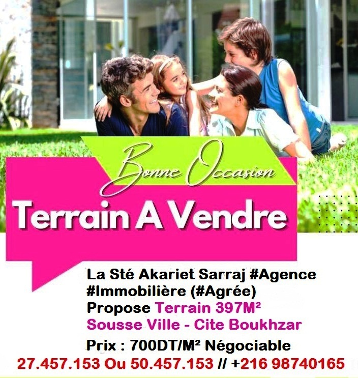 #Terrain [#397M²] Pas Loin #... Type d'annonce : vente Nature d'annonce : Offre Surface : 397 Prix : 277900 Ville : Sousse Adresse : Pas Loin #L'École Française #Cité Boukhzar Date : 29-10-2022 >>> détail